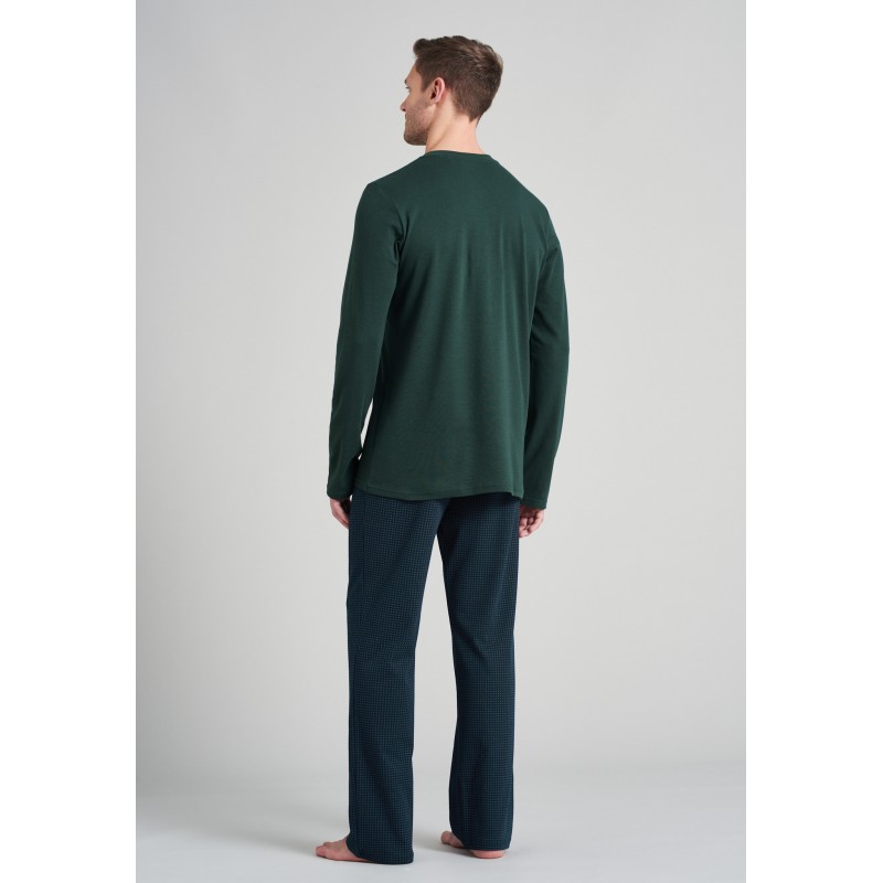 Bij deze nachtmode mag u een lange herenpyjama verwachten van 100 % katoen met een casual design. Het overhemd met lange mouwen met Serafino-kraag, knoopsluiting en opgestikte borstzak met contrasterende naden is een trendy blikvanger met het minimalistische grafische patroon op de broek. De ton-sur-ton koord in de tailleband is een praktisch detail. Zachte fijne interlock neemt het comfortabele deel over - natuurlijk van de beste SCHIESSER-kwaliteit