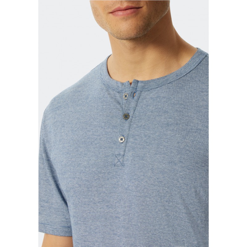 Deze korte herenpyjama scoort met een sportieve look en 100% zacht, onderhoudsvriendelijk biologisch katoen. Een Serafino-kraag met knoopsluiting geeft het topje een fashionable touch met blauwe en witte finelinerstrepen. De korte, donkerblauwe broek vormt een harmonieuze tegenhanger. De letterprint maakt het een echte eye-catcher. De losse, lichte single jersey maakt het tweedelige pak bijzonder comfortabel. Voor veeleisende mannen die 's nachts liever ontspannen in de beste SCHIESSER-kwaliteit!